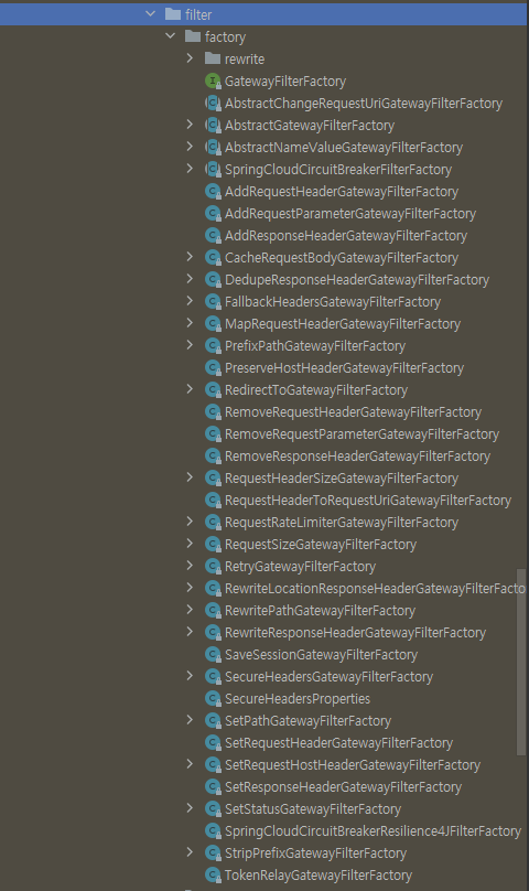 org.springframework.cloud.gateway에서 기본적으로 제공하는 필터는 아래와 같이 수십 개의 필터를 제공한다.