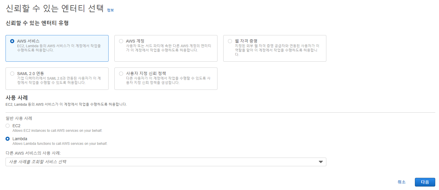 3. 신뢰할 수 있는 엔터티 유형 "AWS 서비스" 선택, 사용 사례 Lambda 선택 후 "다음"