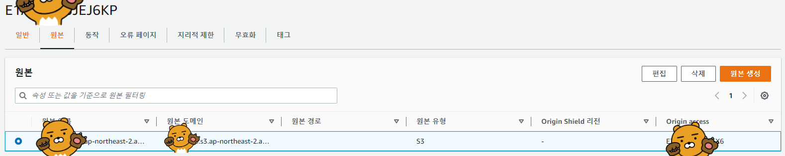 4. 배포된 CloudFront 상세 화면에서 "원본" 탭 - 원본 선택 후 편집