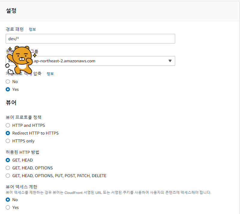 2. ClounFront 배포할 때와 정말 동일하다 단, 경로 패턴만 제외! 아래와 같이 작성하고 동작 생성한다.