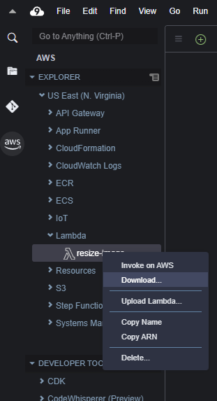 1. 실행된 Cloud9 왼쪽 사이드 메뉴에 AWS 선택 - US East - Lambda - resize-image - 오른쪽 클릭 - 다운로드