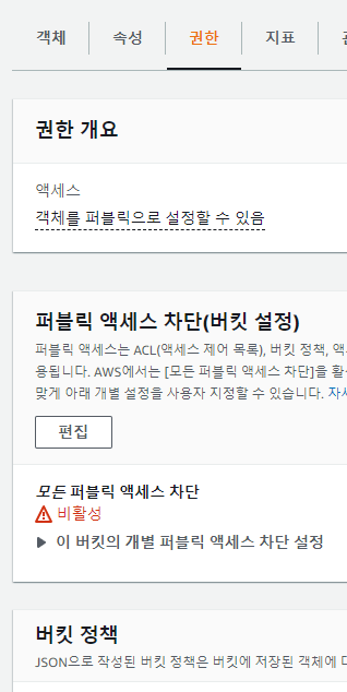 6. S3 콘솔로 이동하여 버킷 상세 화면에서 "권한" 탭에 버킷 정책에 붙여 넣는다.