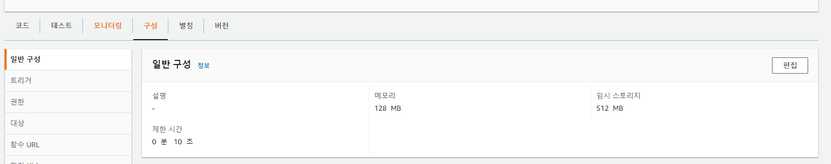 8. 생성된 함수 상세 화면에서 "구성" 탭 - "일반 구성" 편집으로 제한 시간은 10초 변경