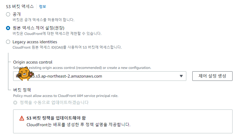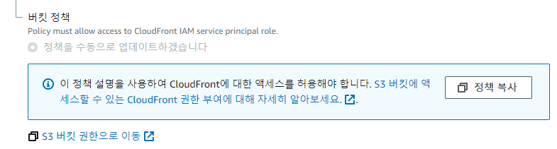5. 정책 복사 (CloudFront에서 S3로 액세스 할 수 있도록 정책을 복사하고 S3에 등록해야 한다. S3 액세스 권한을 아까 모두 해제했기 때문에.)