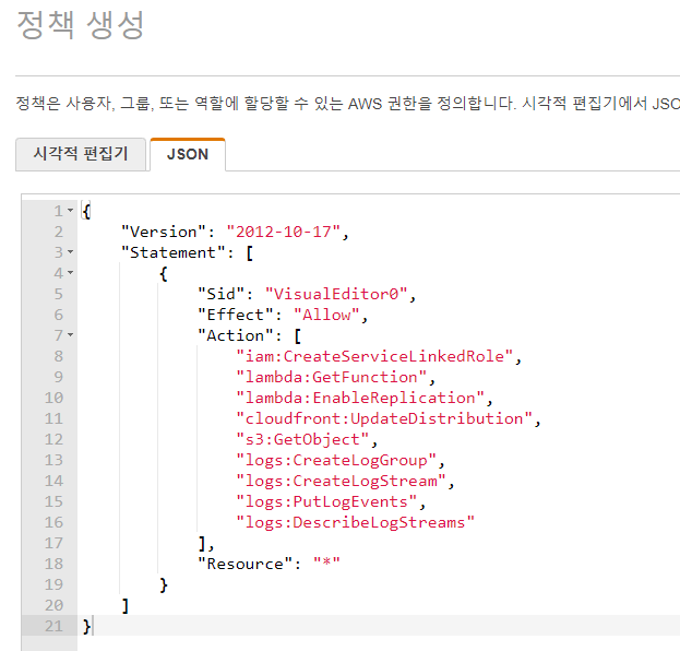 { "Version": "2012-10-17", "Statement": [ { "Sid": "VisualEditor0", "Effect": "Allow", "Action": [ "iam:CreateServiceLinkedRole", "lambda:GetFunction", "lambda:EnableReplication", "cloudfront:UpdateDistribution", "s3:GetObject", "logs:CreateLogGroup", "logs:CreateLogStream", "logs:PutLogEvents", "logs:DescribeLogStreams" ], "Resource": "*" } ] } |