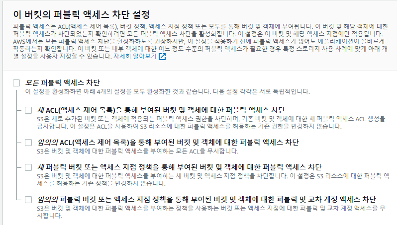 4. 이 버킷의 퍼블릭 액세스 차단 설정 체크 다 풀기