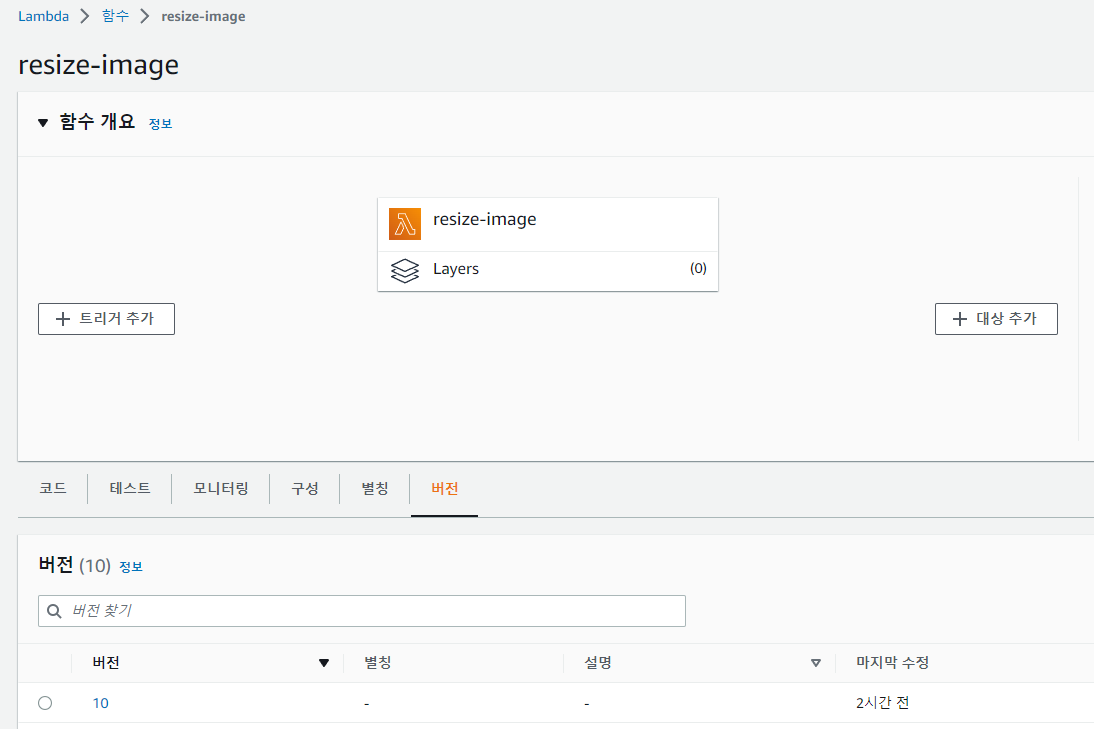 확인하는 방법은 Lambda 콘솔로 이동하여 "resize-image" 함수 상세 화면에 버전 탭이 있다.