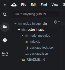 3. 사이드 메뉴 폴더 누르면 resize-image 폴더에 뭔가가 다운로드됨. ( 저는 node-modules, package.json 등 몇 가지 파일이 더 있습니다. -> 4번 진행하면 됨. )