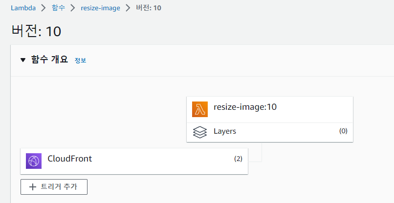 2. dev/*, prod/* 둘 다 배포를 해주고 나면 resize-image 버전에 들어가서 해당 버전의 상세 화면에 아래와 같이 CloudFront 트리거가 추가된 것들 확인할 수 있다.