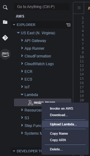 7. 왼쪽 메뉴 AWS - US East - Lambda - resize-image 오른쪽 클릭 Upload Lambda 클릭