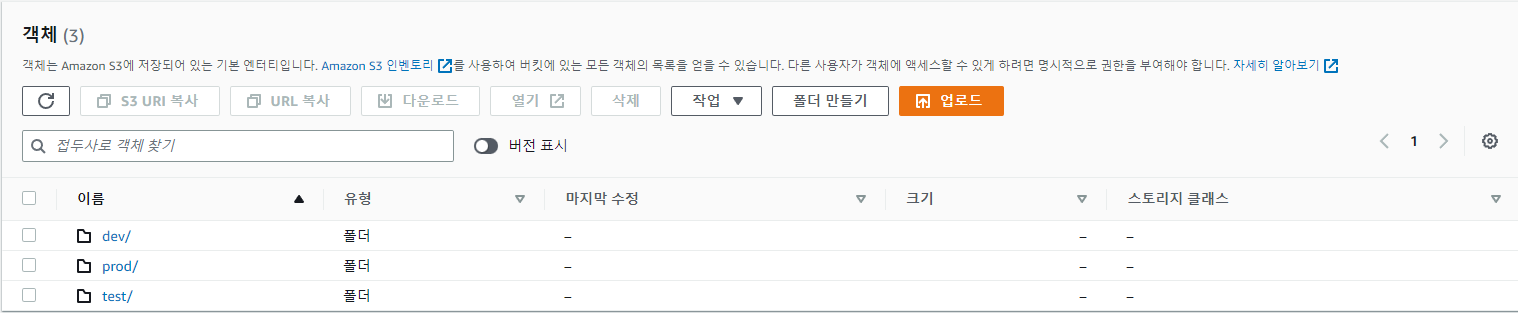 6. 버킷에 "dev", "prod" 폴더 만들기