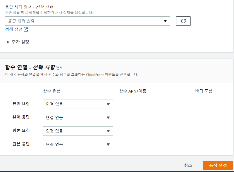 주의할 점은 CloudFront event가 응답이라는 것이다. 추가로 Cache behavior는 입력하는 게 아닌 CloudFront에서 생성해준 동작을 선택하는 것이다 리스트가 안 뜬다면 CloudFront 동작 생성 부분이 이상한 것..